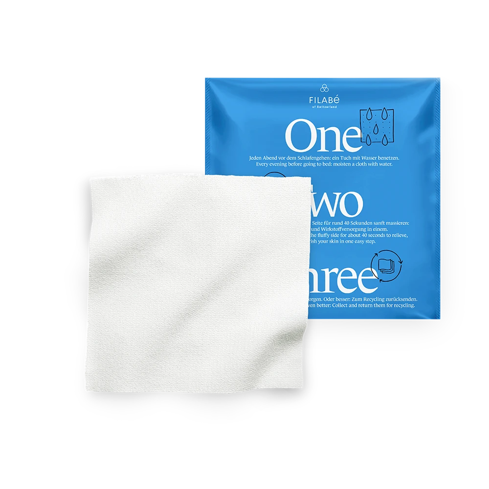 Benutze Filabé SkinRepair immer vor dem Schlafengehen: Benetze das Tuch mit Wasser, um die Wirkstoffe zu aktivieren. Mach es gleichmässig feucht. Nicht auswringen.