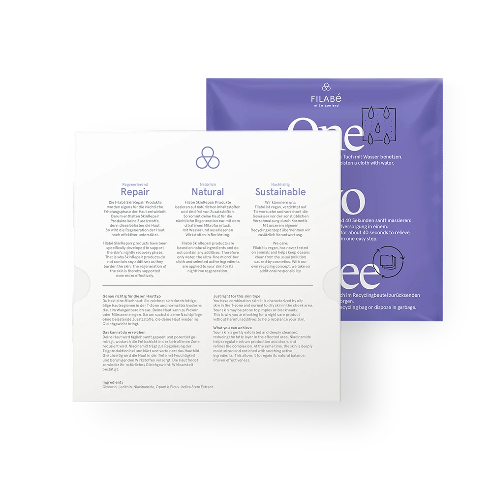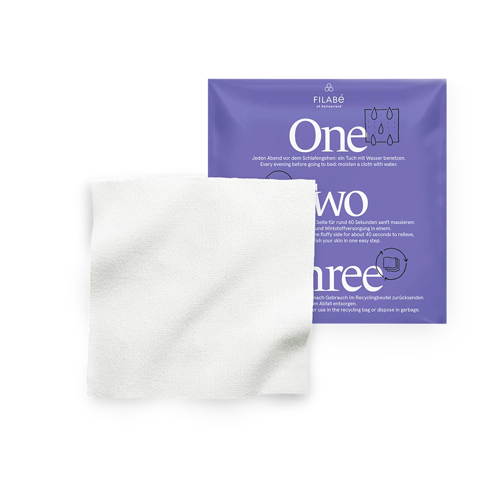 Benutze Filabé SkinRepair immer vor dem Schlafengehen: Benetze das Tuch mit Wasser, um die Wirkstoffe zu aktivieren. Mach es gleichmässig feucht. Nicht auswringen.